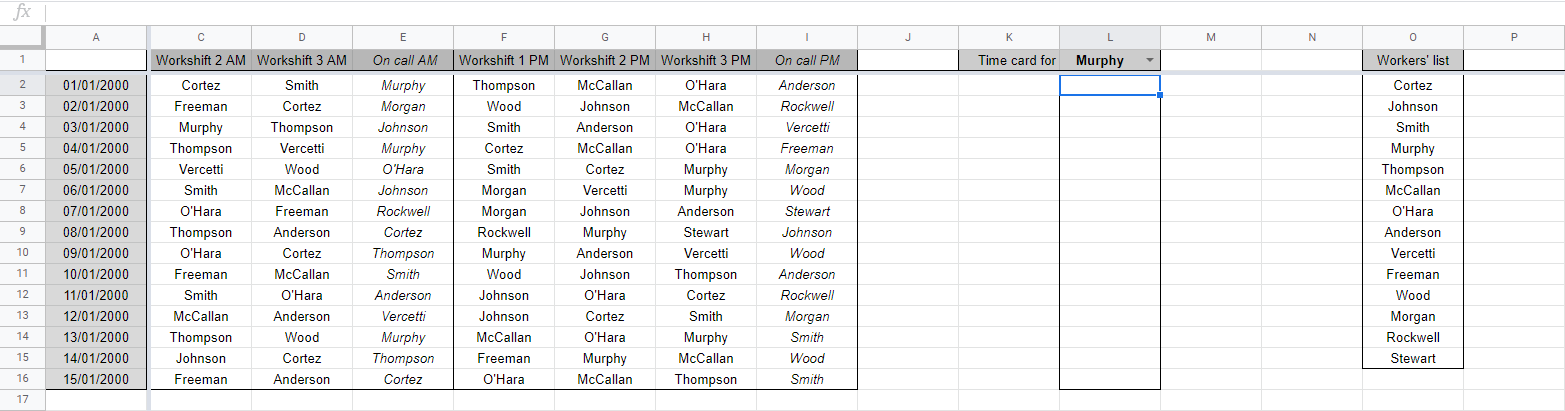 这不是一个最佳的解决方案,因为我必须以非常耗时且不灵活的方式手动编写数组(向工作轮班中添加另一个列/另一个工作人员意味着我必须更正每一行)。