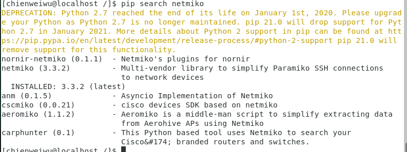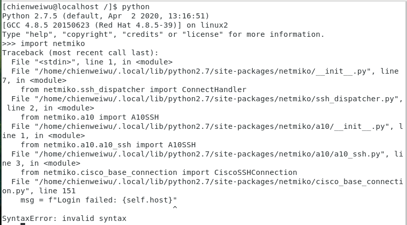 python3 -m pip install netmikoPython2.x命令没有工作。似乎最新的netmiko不再支持3.x下的python版本了。