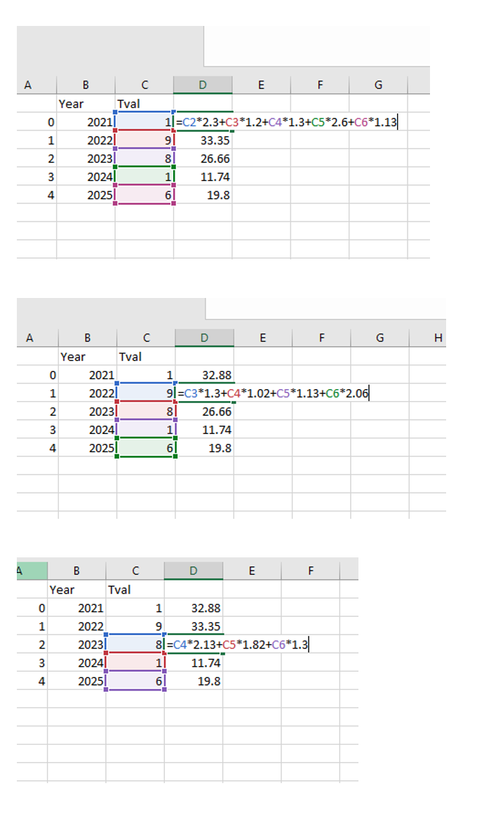 [0.54315584 0.20083916 0.28262627 0.01919842 0.58714358]]点积将是weights的第一行,乘以df["Tval"]的值,然后将每一项乘积之和。然后它将接受weights的第2行并执行相同的操作,但是由于我们将第二行的第一个值设置为0,我们实际上将忽略df["Tval"]的第一个值,并对其余的值进行乘/和。就这样等等。