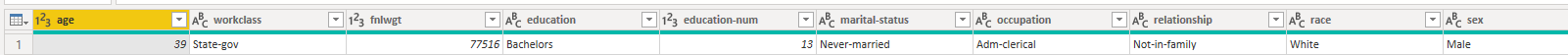 #"Tipo Alterado" = Table.TransformColumnTypes(Origem,{{"age", Int64.Type}, {"workclass", type text}, {"fnlwgt", Int64.Type}, {"education", type text}, {"education-num", Int64.Type}, {"marital-status", type text}, {"occupation", type text}, {"relationship", type text}, {"race", type text}, {"sex", type text}, {"capital-gain", Int64.Type}, {"capital-loss", Int64.Type}, {"hours-per-week", Int64.Type}, {"native-country", type text}}),