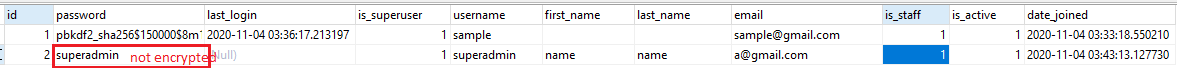 Django不将原始密码存储在数据库中。它只是将加密的一个存储在一个名为password的列中。当您以这种方式为用户创建密码时,您将使用原始数据填充该列。“超级管理员”是加密的密码。