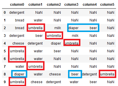 ['bread', 'umbrella', 'milk', 'diaper', 'beer'],