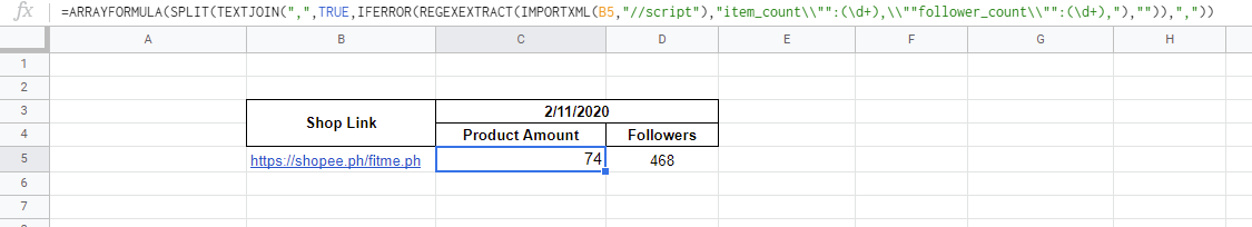 =ARRAYFORMULA(SPLIT(TEXTJOIN(",",TRUE,IFERROR(REGEXEXTRACT(IMPORTXML(B5,"//script"),"item_count\\"":(\d+),\\""follower_count\\"":(\d+),"),"")),","))https://shopee.ph/fitme.ph的URL放在单元格"B5“中。IMPORTXML检索Javascript。item_count\\"":(\d+),\\""follower_count\\"":(\d+),和REGEXEXTRACT的正则表达式检索"Products“和”关注者“的值。TEXTJOIN和SPLIT删除空行。结果: