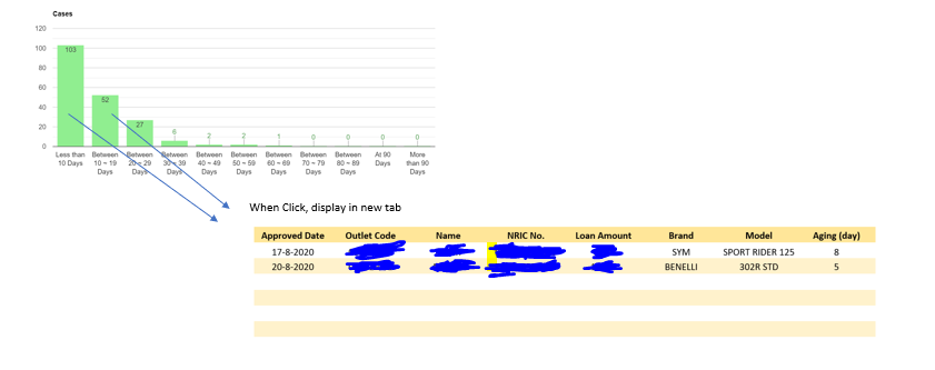 我想在google图表中为它的每一个列图添加外部链接,以获得datediff的老化天数(current_timestamp,inserted_time从数据库)作为图像提供的天数之间的时间。