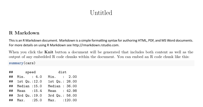 When you click the **Knit** button a document will be generated that includes both content as well as the output of any embedded R code chunks within the document. You can embed an R code chunk like this:
