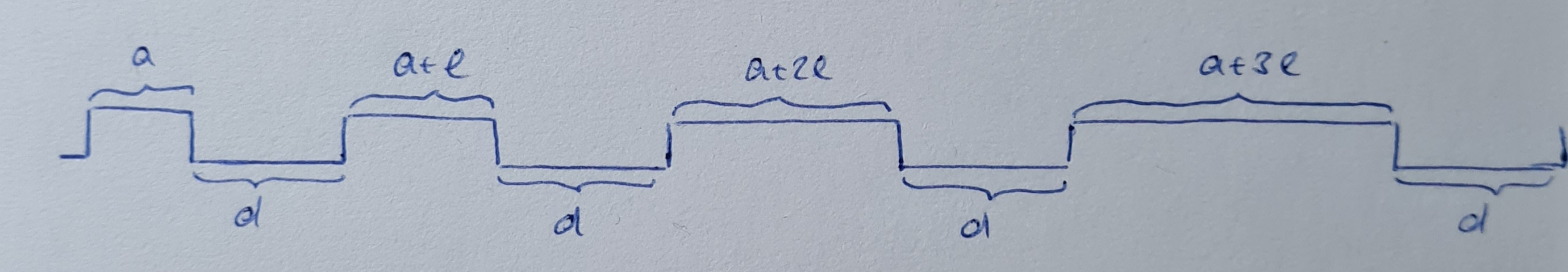 在素描d是脉冲之间的间隙,a是起始脉冲长度,l是长度增加的常数。