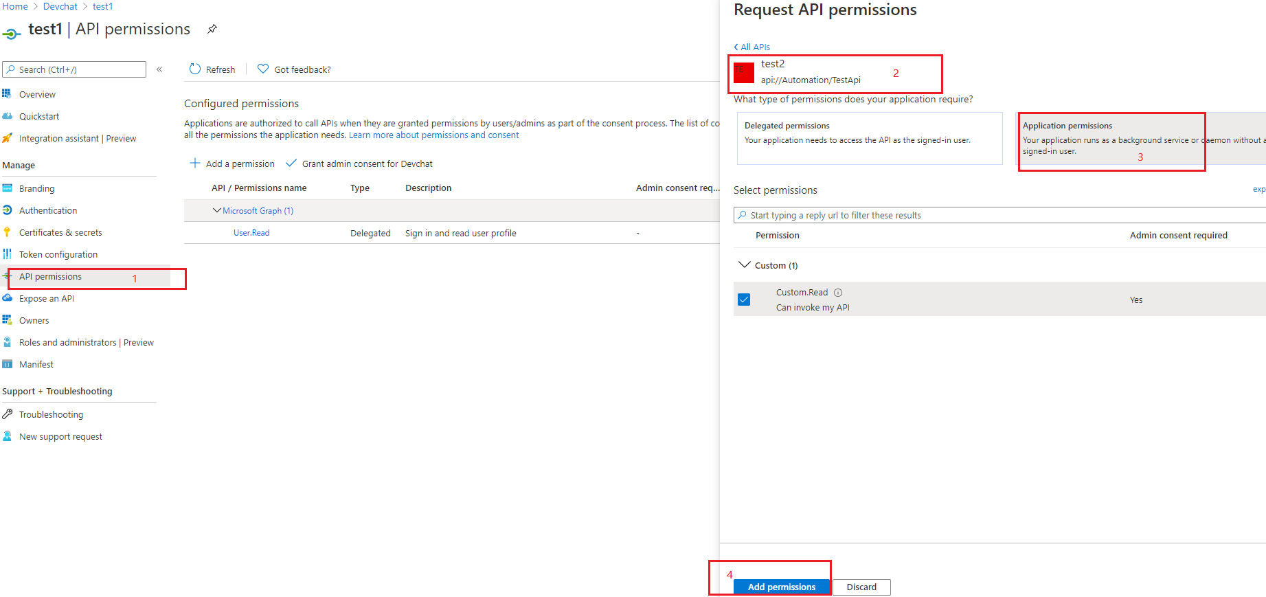 由于使用的是客户端凭据流,接下来,需要定义api应用程序的清单,并将应用程序权限授予客户端应用程序(这是您自己定义的角色权限,添加权限时可以在My 中找到).Then,您需要单击管理同意按钮来授予管理员对此权限的同意。
