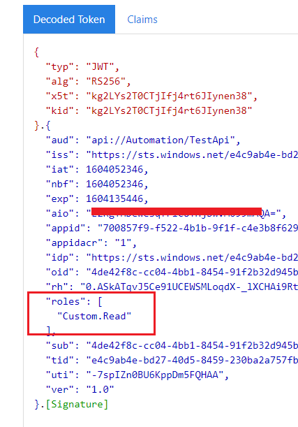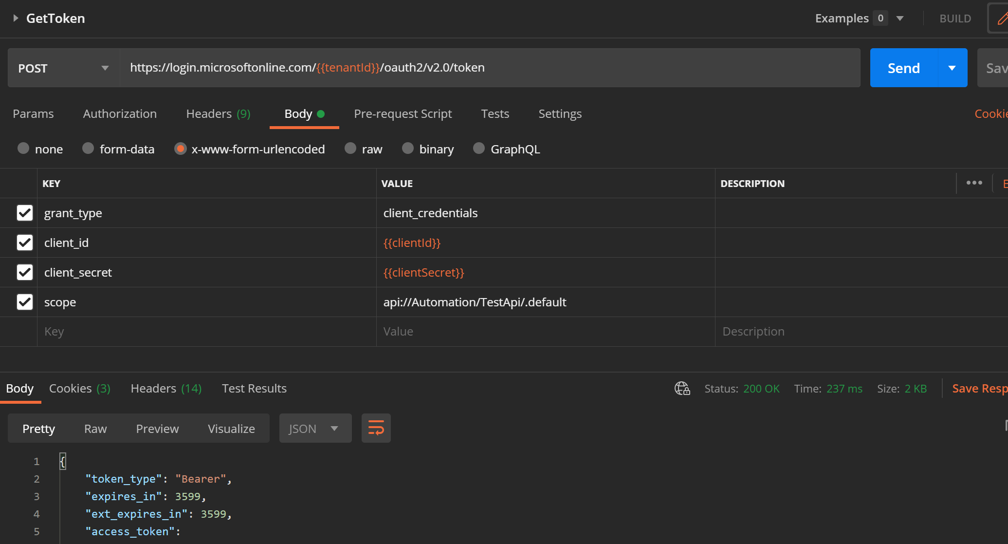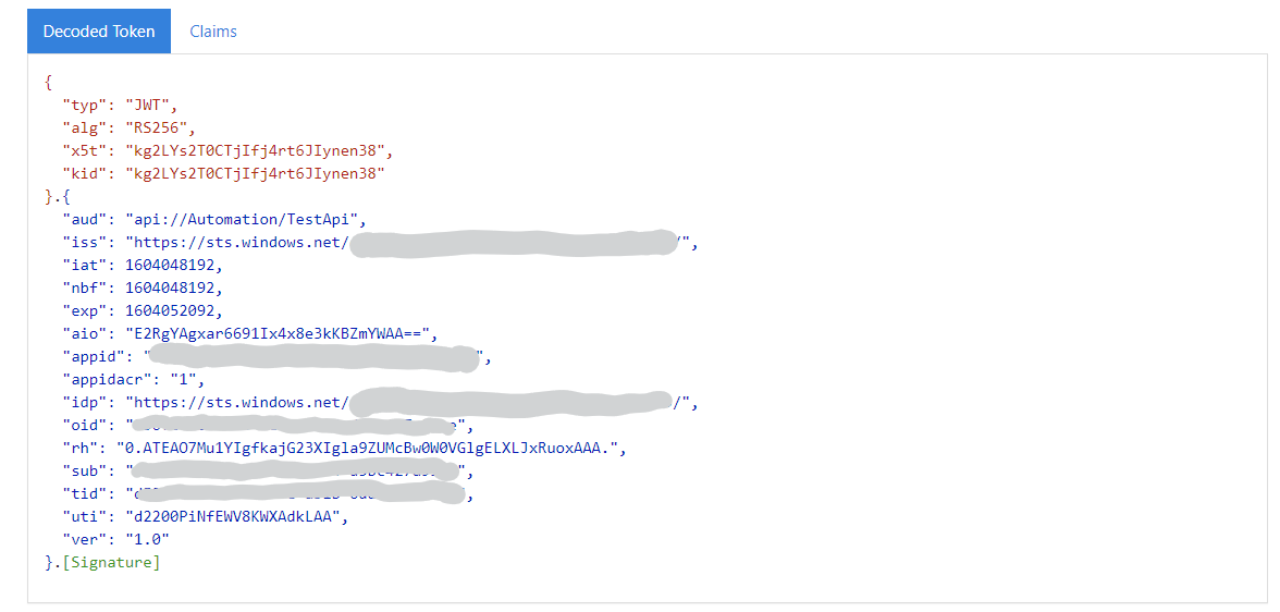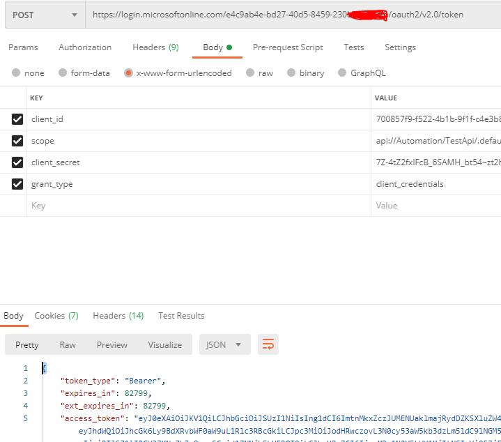 我在应用程序注册中添加了一个客户端秘密,visual创建并将一个postman请求放在一起,如下所示,使用Application ( client ) Id和api://Automation/TestApi/..default作为作用域。