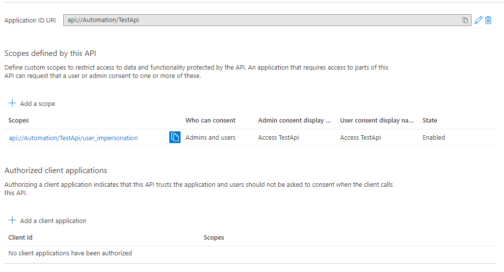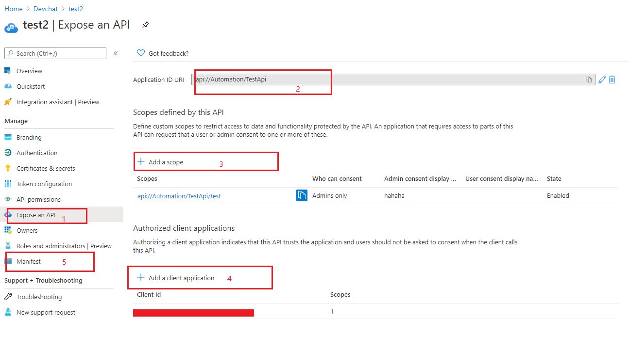 Azure portal>App registrations>Expose a API>Add a scope>Add客户端应用程序