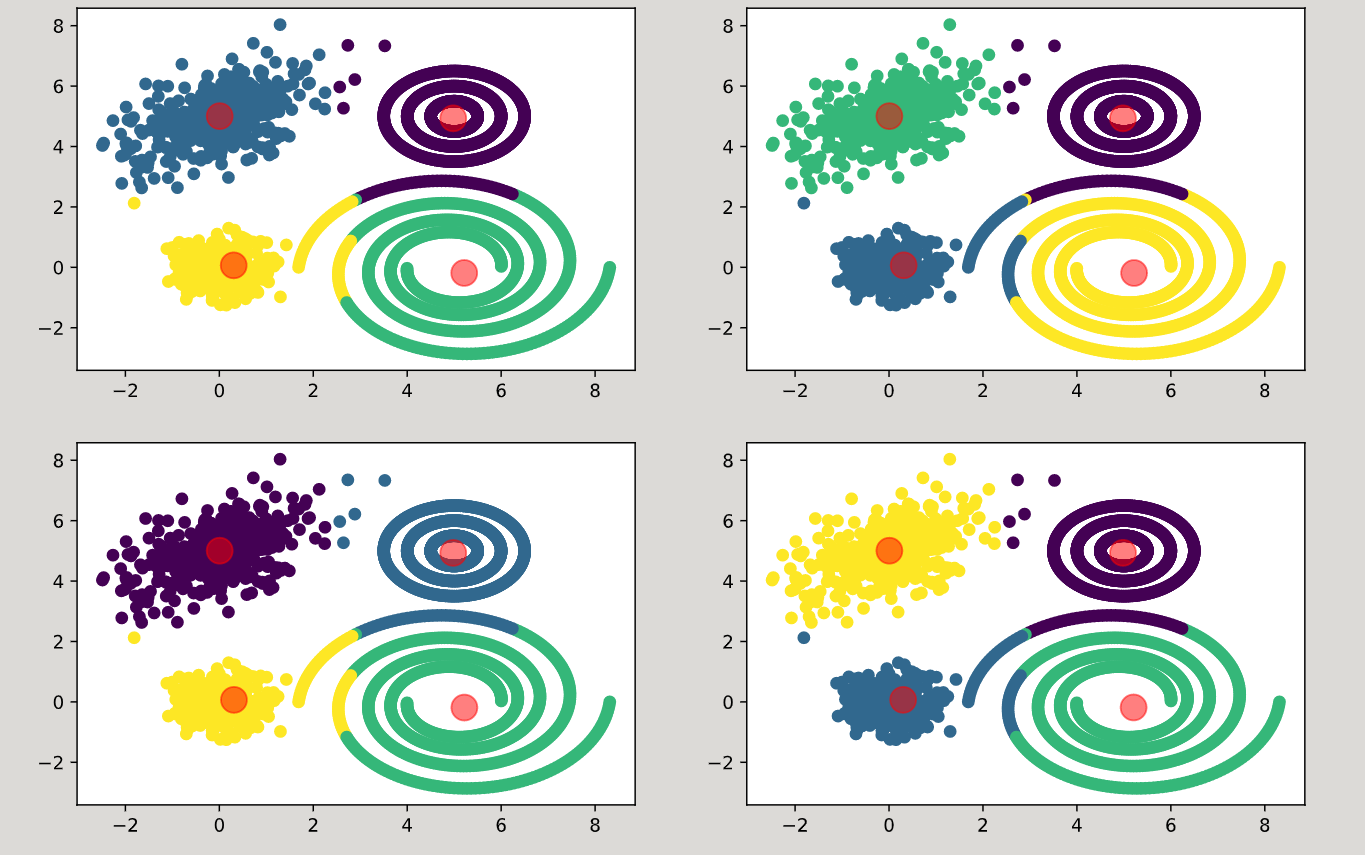 他们不一样。它们是相似的。K-均值算法是一种迭代移动质心的算法,这样它们在分割数据时变得越来越好,虽然这个过程是确定性的,但是你必须为这些质心选择初始值,这通常是随机的。随机开始,并不意味着最终的质心会是随机的。它们将汇聚到一些相对好的东西上,而且往往是相似的。