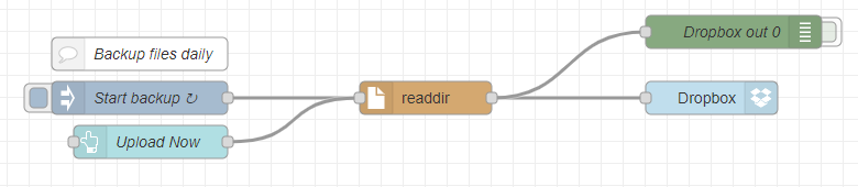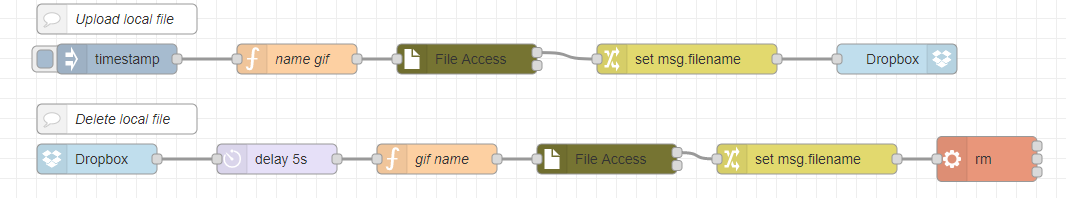[{"id":"4fd3d436.eb8fcc","type":"tab","label":"DropBox","disabled":false,"info":""},{"id":"8e054ce8.884b","type":"function","z":"4fd3d436.eb8fcc","name":"name gif","func":"msg.path = \"/home/pi/.node-red/static/gif/old/\";\n\nmsg.filename = \"img20201027_144920.gif\";\n\nmsg.payload = msg.path + msg.filename\n\nreturn msg;","outputs":1,"noerr":0,"initialize":"","finalize":"","x":420,"y":180,"wires":[["15144f44.cf7dc1"]]},{"id":"2377960c.da806a","type":"dropbox out","z":"4fd3d436.eb8fcc","dropbox":"","filename":"","localFilename":"","name":"Dropbox","x":1020,"y":180,"wires":[]},{"id":"7a40742d.26a4dc","type":"inject","z":"4fd3d436.eb8fcc","name":"","props":[{"p":"payload"},{"p":"topic","vt":"str"}],"repeat":"","crontab":"","once":false,"onceDelay":0.1,"topic":"","payload":"","payloadType":"date","x":240,"y":180,"wires":[["8e054ce8.884b"]]},{"id":"41e83491.8e6dbc","type":"dropbox in","z":"4fd3d436.eb8fcc","dropbox":"","filepattern":"","name":"","x":220,"y":280,"wires":[["5941e355.c66b9c"]]},{"id":"3003a90.8933658","type":"function","z":"4fd3d436.eb8fcc","name":"gif name","func":"msg.path = \"/home/pi/.node-red/static/gif/old/\";\n\nmsg.filename = msg.file;\n\nmsg.payload = msg.path + msg.filename\n\nreturn msg;","outputs":1,"noerr":0,"initialize":"","finalize":"","x":560,"y":280,"wires":[["3eeef854.713178"]]},{"id":"5941e355.c66b9c","type":"delay","z":"4fd3d436.eb8fcc","name":"","pauseType":"delay","timeout":"5","timeoutUnits":"seconds","rate":"1","nbRateUnits":"1","rateUnits":"second","randomFirst":"1","randomLast":"5","randomUnits":"seconds","drop":false,"x":400,"y":280,"wires":[["3003a90.8933658"]]},{"id":"9d041a38.f66f48","type":"exec","z":"4fd3d436.eb8fcc","command":"rm ","addpay":true,"append":"","useSpawn":"false","timer":"","oldrc":false,"name":"","x":1110,"y":280,"wires":[[],[],[]]},{"id":"77b26b64.855c54","type":"comment","z":"4fd3d436.eb8fcc","name":"Delete local file","info":"Once the file is on dropbox, get the path and file name and delete the local file then","x":240,"y":240,"wires":[]},{"id":"15144f44.cf7dc1","type":"fs-ops-access","z":"4fd3d436.eb8fcc","name":"","path":"path","pathType":"msg","filename":"filename","filenameType":"msg","read":true,"write":true,"throwerror":false,"x":590,"y":180,"wires":[["f0f07147.1b318"],[]]},{"id":"f0f07147.1b318","type":"change","z":"4fd3d436.eb8fcc","name":"","rules":[{"t":"set","p":"filename","pt":"msg","to":"payload","tot":"msg"}],"action":"","property":"","from":"","to":"","reg":false,"x":810,"y":180,"wires":[["2377960c.da806a"]]},{"id":"22c79cc5.761a64","type":"comment","z":"4fd3d436.eb8fcc","name":"Upload local file","info":"Check if the file exists locally. If it does, then upload it to dropbox","x":240,"y":140,"wires":[]},{"id":"3eeef854.713178","type":"fs-ops-access","z":"4fd3d436.eb8fcc","name":"","path":"path","pathType":"msg","filename":"filename","filenameType":"msg","read":true,"write":true,"throwerror":false,"x":730,"y":280,"wires":[["2ef8b77b.eb0658"],[]]},{"id":"2ef8b77b.eb0658","type":"change","z":"4fd3d436.eb8fcc","name":"","rules":[{"t":"set","p":"filename","pt":"msg","to":"payload","tot":"msg"}],"action":"","property":"","from":"","to":"","reg":false,"x":930,"y":280,"wires":[["9d041a38.f66f48"]]}]发布于 2020-11-10 16:38:39