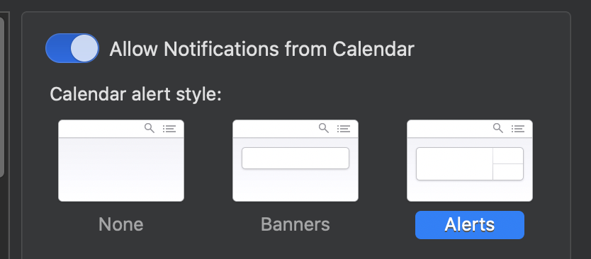 我在SDK10.15中使用了UserNotifications.framework,并在Catalina上进行了测试(10.15.6)。我希望通知能够正常运行,Calendar arpp通知是如何工作的。