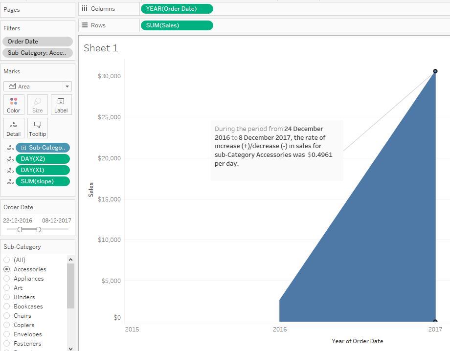 During the period from <DAY(X1)> to <DAY(X2)>, the rate of increase (+)/decrease (-) in sales for sub-Category <Sub-Category> was $<SUM(slope)> per day.这能让我看到这样的景象。不用说,我已经在$/日内计算了斜率;您可以按口味调整斜率,同时在斜率中输入datepart .。