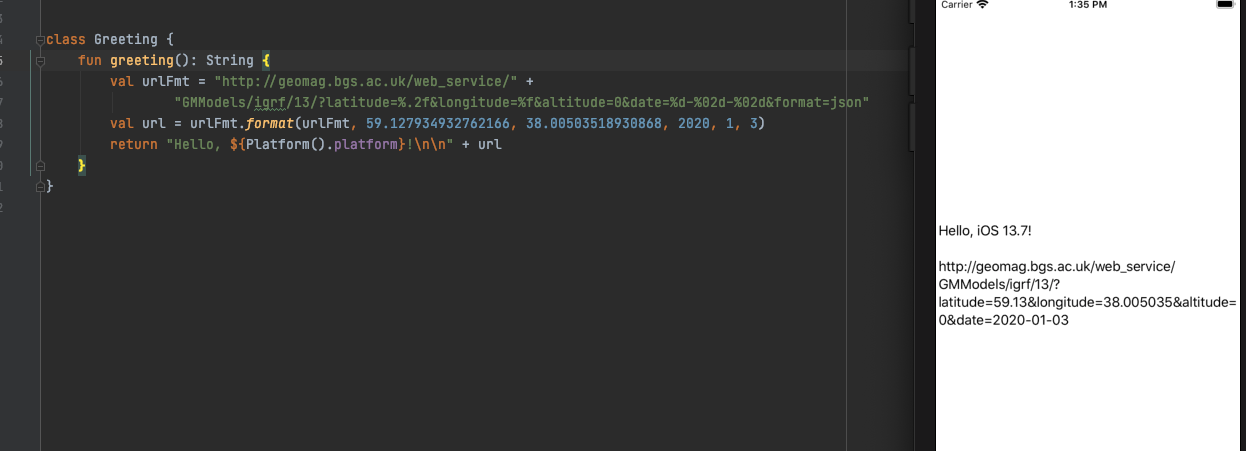 val url = fmt.format(urlFmt, 59.127934932762166, 38.00503518930868, 2020, 1, 3)http://geomag.bgs.ac.uk/web_service/GMModels/igrf/13/?latitude=0.000000&longitude=0.000000&altitude=0&date=43344272-198763328-00&format=json编辑