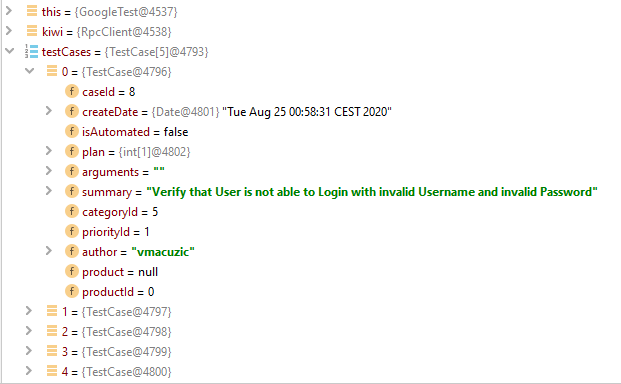 TestCase[] testCases = kiwi.getRunIdTestCases(2);我得到: