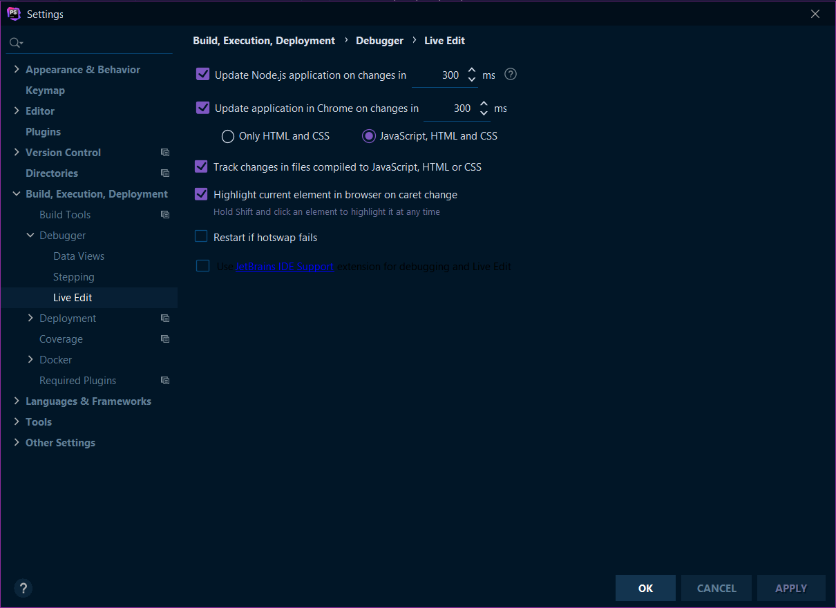 我想使用LiveEdit插件在PhpStorm上调试我的网站。我已经在设置中配置了插件,甚至下载了JetBrains Chrome扩展并应用于Microsoft。我也允许分机读和写,并对所有和每个网站进行更改。然而,我不认为LiveEdit有效。