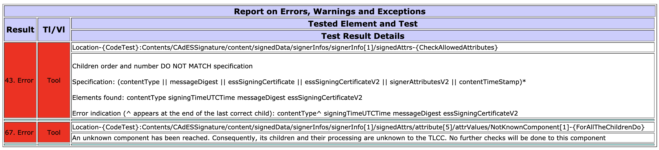 现在,这是唯一的一个错误,它的数字63说,Location-{CodeTest}:Contents/CAdESSignature/content/signedData/signerInfos/signerInfo1/signedAttrs/attribute4/attrValues/NotKnownComponent1-{ForAllTheChildrenDo},一个未知的组件已经到达。因此,它的孩子和他们的处理是未知的TLCC。将不再对此组件进行检查。