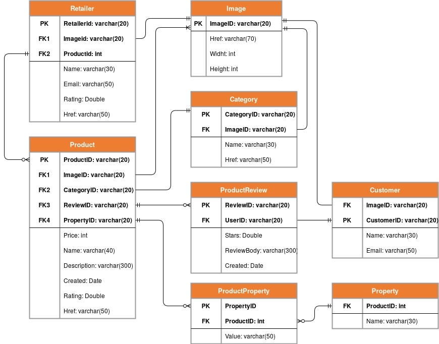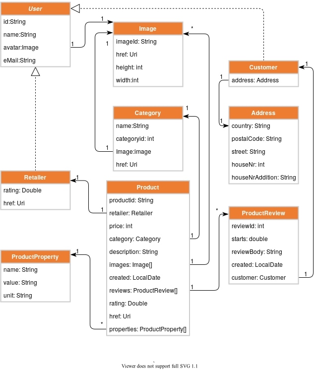 我创建了一个域和数据库模型。域模型用于rest。它们都有相似的部件,如产品、类别、客户、零售商等。但如果你仔细看看这两种模型。你可以看到一些不同之处。例如,您可以看到,在数据库模型中,零售商有多个产品。但是在域模型中,您可以看到每个产品都有一个零售商。这样做的原因是因为我需要能够向不同的零售商返回多个产品的列表。