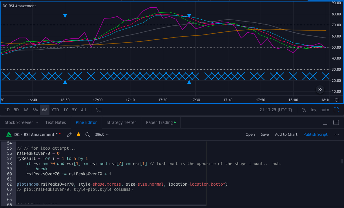 当RSI保持在70以上时,我想数数RSI线产生的“峰”数,然后在其中5次出现时(即5次出现在70以下之前)绘制一个形状。
