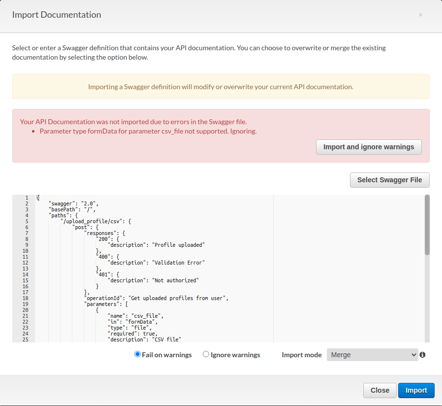 }当我转到API网关-->文档--> Import并粘贴json时,我得到以下错误: