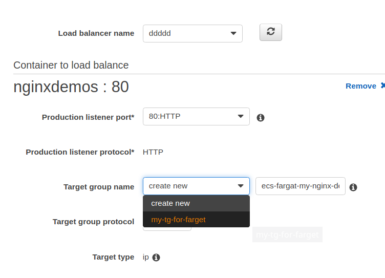 您可以在创建ALB时创建TG (在我的示例中,ALB称为dddd ),或者预先创建。ALso,我把我的目标组命名为ALso我使用端口80 (您可能需要5000),因为我使用nginxdemos/hello作为容器。确保创建IP目标类型为,而不是实例。Fargete将不使用实例TGs,解释为什么在创建ECS服务时不能在ECS控制台中看到它们。