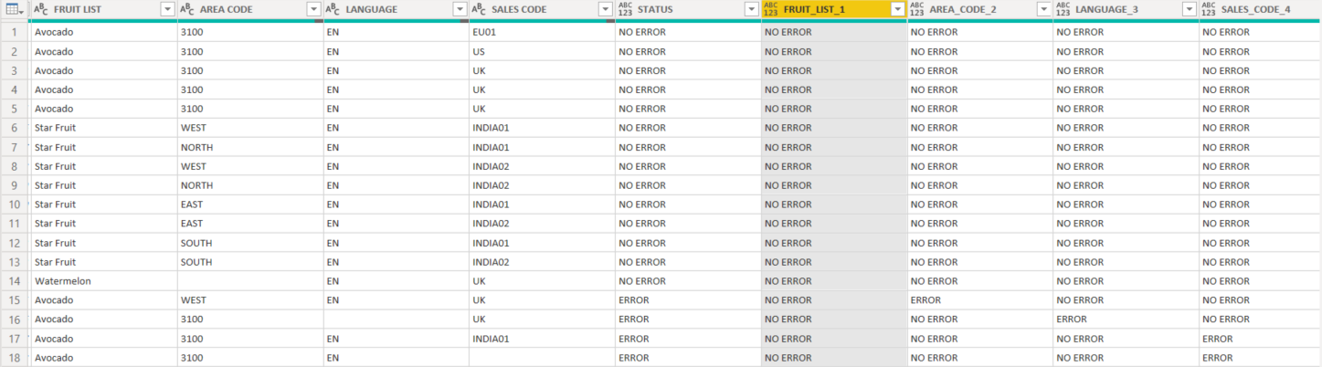 #"Changed Type" = Table.TransformColumnTypes(#"Removed Columns",{{"FRUIT LIST", type text}, {"AREA CODE", type text}, {"LANGUAGE", type text}, {"SALES CODE", type text}}),