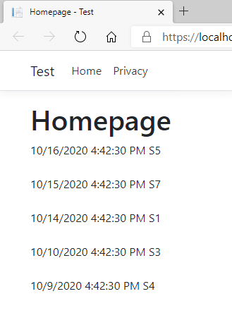 <div> @html.DisplayFor(modelItem => msg.CreatedOn) @html.DisplayFor(modelItem => msg.Subject) </div>MessageViewModel.cs
