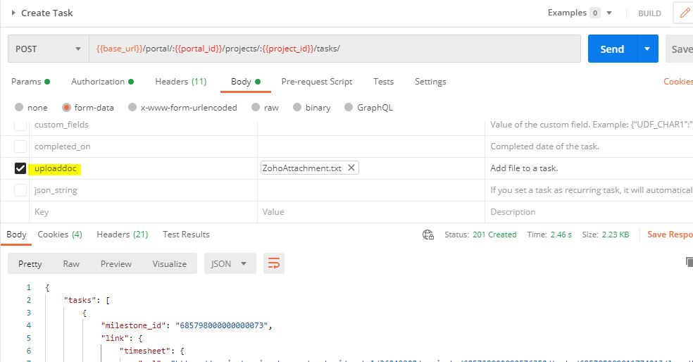 Note:当我通过调用Zoho任务创建API直接尝试与邮递员打交道时,它用文档创建任务。
