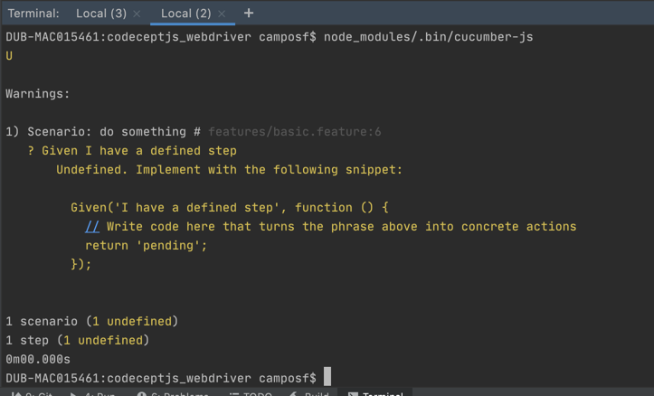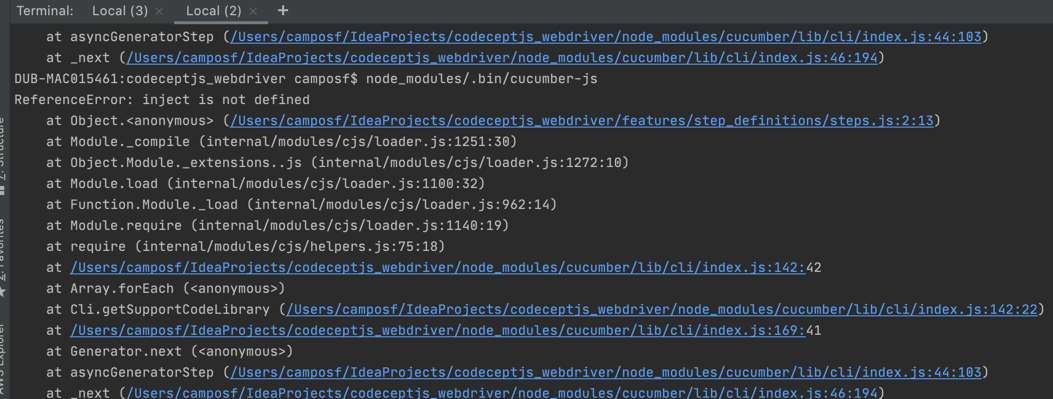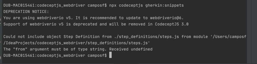 当我在终端上运行:步骤或代码片段时,我会收到这样的消息:Could not include object Step Definition from ./step_definitions/steps.js from module '/Users/myUser/IdeaProjects/codeceptjs_webdriver/step_definitions/steps.js' The "from" argument must be of type string. Received undefined。