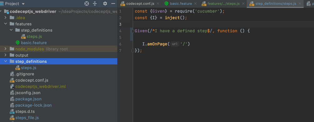 这是我第一次使用CodeceptJs,而且当IDE要求我使用implement steps for my scenario时,我很难运行我的特性文件,但这已经完成了,所以我觉得它可能会在codecept.conf.js文件下指定的其他地方搜索它们?
