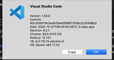 在我的例子中,我使用了MacOS HighSiera10.13.6和新安装的VSCode 1.50.0 (参见下面的屏幕截图):