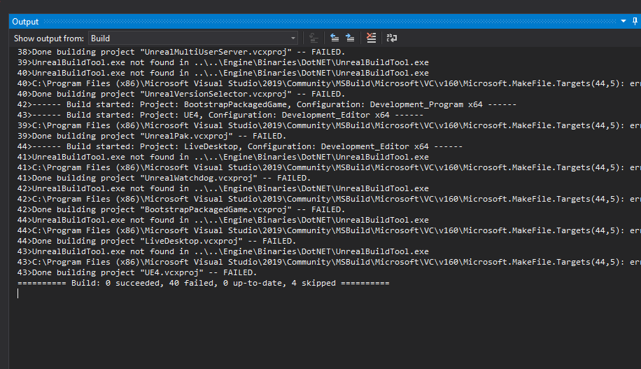 建造引擎时输出消息:..编辑:UnrealEd.dll C:\UE4.24.0-release\Engine\Intermediate\Build\Win64\UE4Editor\Development\UnrealEd\UE4Editor-UnrealEd.suppressed.lib Cr 1> 1> Studio\2019\Community\MSBuild\Microsoft\VC\v160\Microsoft.MakeFile.Targets(44,5):1> (x86)\Microsoft Visual Studio\2019\Community\MSBuild\Microsoft\VC\v160\Microsoft.MakeFile.Targets(44,5):errorMSB3075:命令"....\Build\BatchFiles\Build.bat -Target="UE4Editor Win64 Development“-Target="ShaderCompileWorker Win64 Development -Quiet”-WaitMutex -FromMsBuild“与代码5一起退出。请验证您是否有足够的权限运行此命令。1>Done建筑项目"UE4.vcxproj“--失败。==========构建:0成功,1失败,2最新,0跳过==========