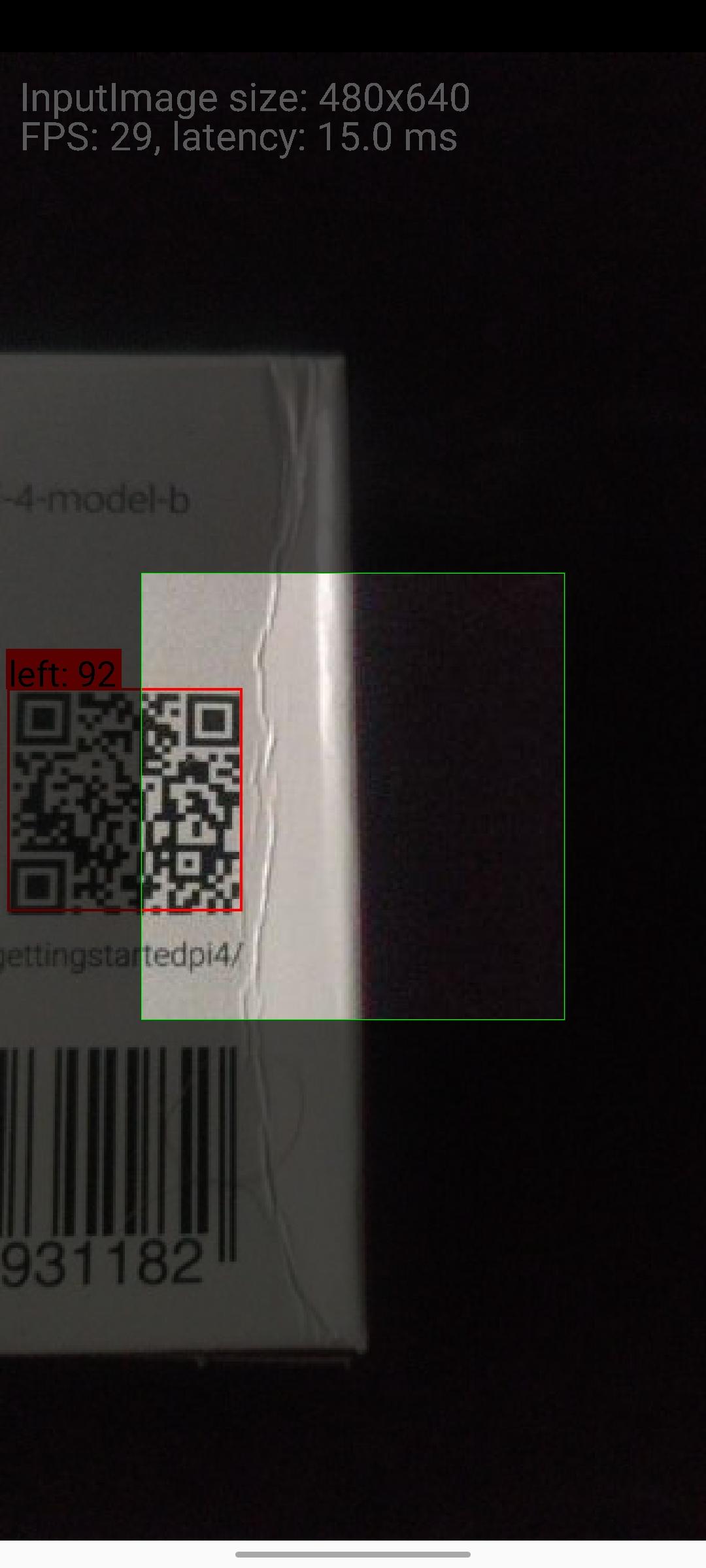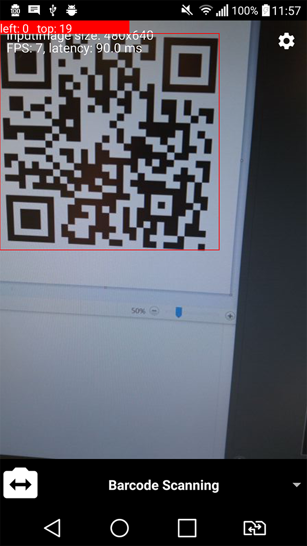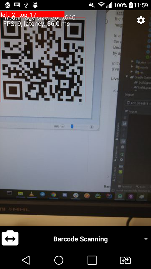 这是输出的可视化结果。正如图片中所显示的那样,barcode的左上角与可见区域的左上角之间的距离从0开始。在左图的情况下,graphicOverlay被设置为480x640的大小(纵横比≈1.3334)和右侧的360x640 (纵横比≈1.7778)的大小。在这两种情况下,在我的手机上,CameraSourcePreview有一个稳定的1440x2056像素大小(高宽比≈1.4278),因此这意味着计算确实反映了barcode在可见区域的位置。