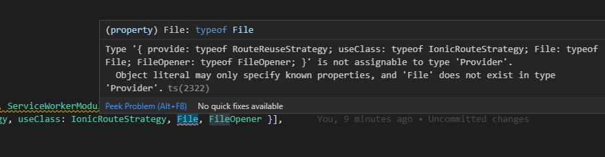 ng.cmd运行应用程序:serve host=localhost-端口=8100 ng块{main} main.js,main.js.map (main) 2.02 kB初始ng块{Poly座} polyfills.js,polyfills.js.map (Poly座) 127 kB初始ng块{运行时} runtime.js,runtime.js.map (运行时) 6.15 kB条目ng块{styles} styles.js,styles.js.map (样式) 93 kB初始ng块{供应商} vendor.js,vendor.js.map (供应商) 341 kB /app/app.module.ts中的初始ng错误:18:100- ERROR TS2322: Type '{ kB:TS2322;useClass: IonicRouteStrategy类型;文件: typeof;FileOpener: typeof FileOpener;}‘不能指定键入'Provider’。ng对象文字只能指定已知的属性,并且“File”不存在于“Provider”类型中。ng 18提供程序: StatusBar,SplashScreen,{ providers: RouteReuseStrategy,useClass: IonicRouteStrategy,File,FileOpener },ng日期: 2020-10-10T05:06:01.413Z - Hash: c963d31c2a4c95edc771 - Time: 8614 06
