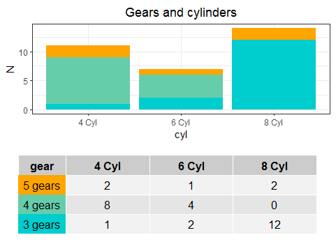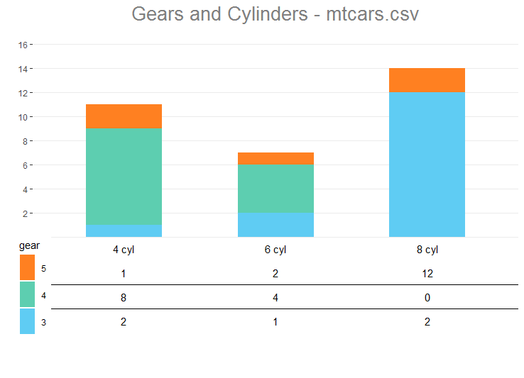 我有一个使用mtcar数据集在excel中创建的条形图,但是我需要在R中创建它,我知道如何制作一个堆叠的图表,但是可以添加像下面这样的数据表/与图形集成吗?