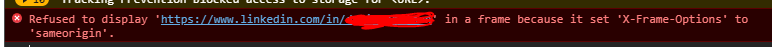 我正在制作我的网站,我想把我的LinkedIn配置文件在生物技术部分。然而,当我使用iframe时,我发现LinkedIn拒绝连接。有没有一种方法可以将我的LinkedIn配置文件嵌入到我的网站中?谢谢!