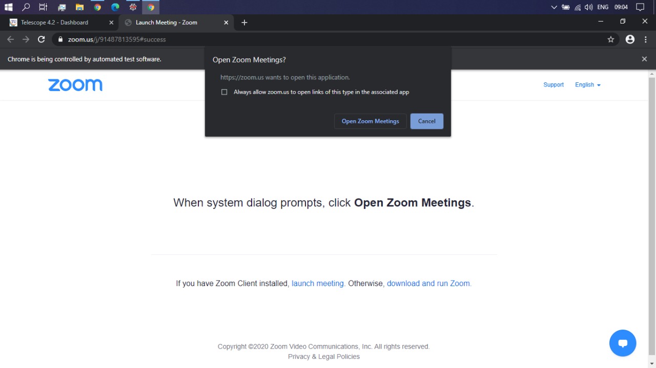 是否可以自动化提示事件,即使用selenium打开缩放会议?因此,我们通常使用selenium在CHROME webdriver上自动打开会议链接,但不能像下面的屏幕快照那样单击“打开缩放会议”按钮,是否有一种使用selenium和python的方法?