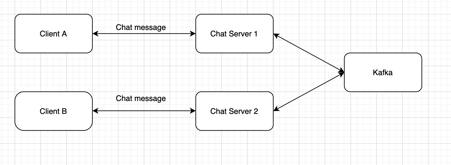 client A通过WebSocket.client B连接到chat server 1,通过WebSocket.chat server1 and 2连接到chat server 2,订阅Kafka topic 'chat'client A将聊天消息发送到chat server 1.chat server1,首先存储聊天消息到DB,然后将消息发布到Kafka topic 'chat'。消息包含聊天室id、聊天内容、发送方id.chat server2接收来自Kafka主题的'chat'.chat server2过滤消息,其中有joined.chat server2聊天室id的client B.发送过滤消息给client B.。