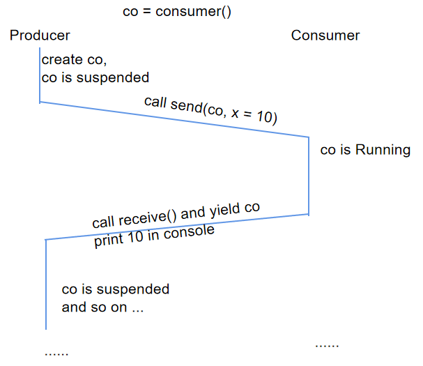 consumer(producer())请注意,这是consumer(producer()),而不是相反。还请注意,producer是协同线,而不是consumer。此外,send收益和receive恢复。