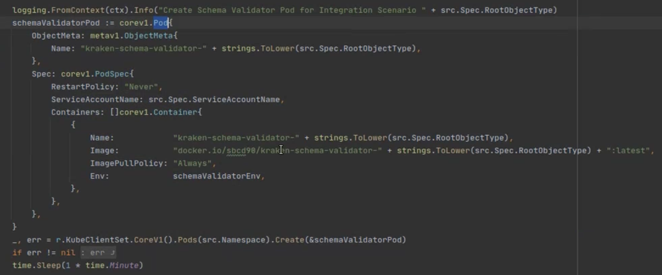 我已经编写了一个自定义资源作为部署的一部分。作为reconcileKind函数的一部分,我编写了创建pod的逻辑,如下所示,使用Go中的Kubernetes API。