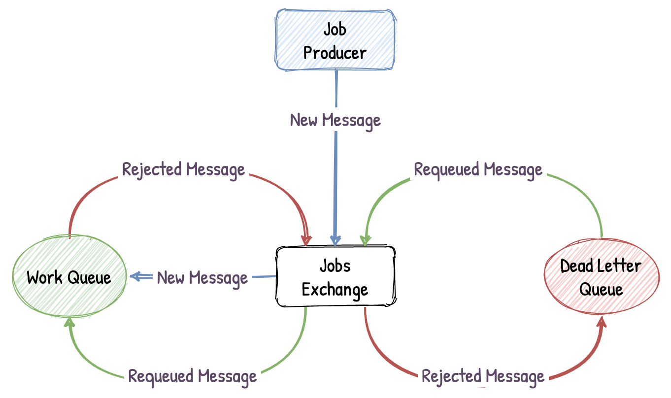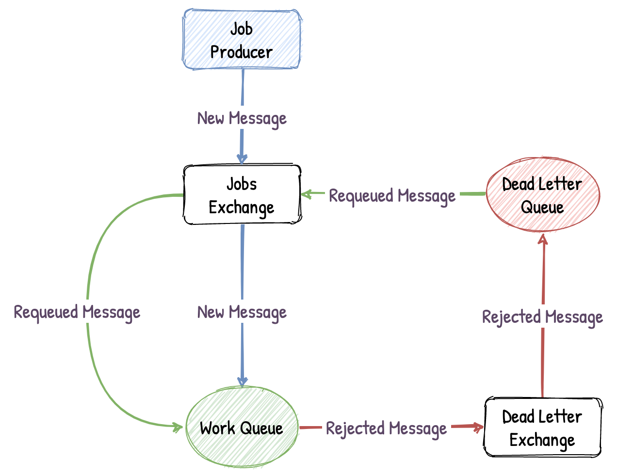 我用队列设置了一个死信路由,以请求延迟数秒的被拒绝消息,防止临时使用者错误阻塞队列。我已经将其设置为工作队列和死信队列都绑定到相同的交换: