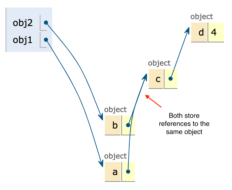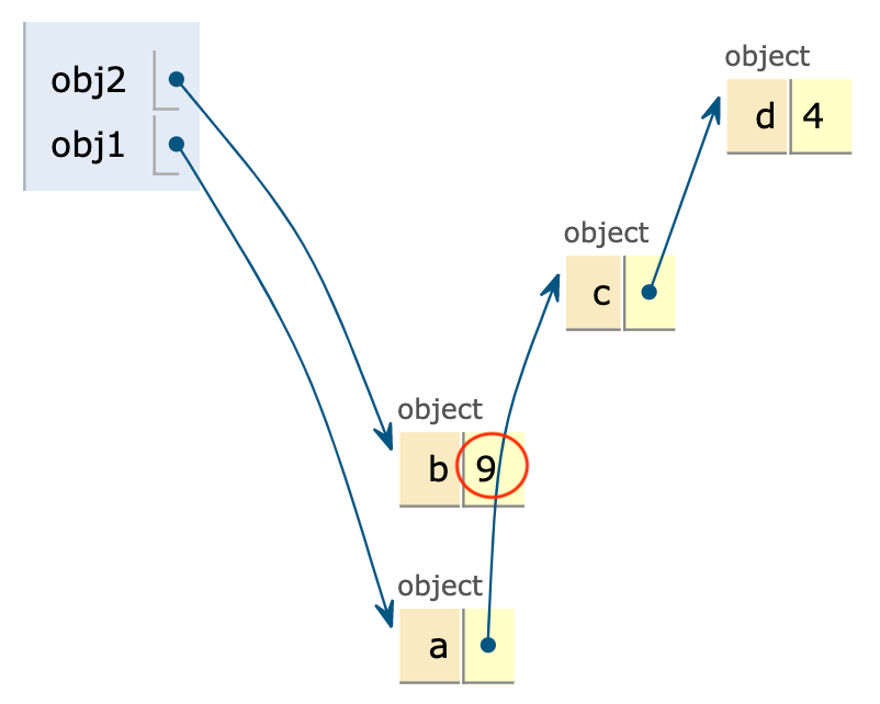 如您所见,用于b的obj2键现在保存值9,而不再保存对对象的引用。但是,obj1仍然保存对对象的引用。因此,当您记录obj1时,仍然会看到嵌套对象的c和d属性。