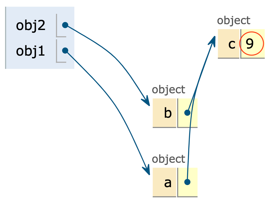 在这种情况下,对象1和对象2的键a和b仍然在内存中存储对同一个对象的引用(与前面的场景不同)。这一次,它们在内存中都指向的对象被更新,以便c键处的值不再是对内存中的对象的引用,而是值9。因此,当您同时记录obj1和obj2时,您会看到相同的嵌套对象。