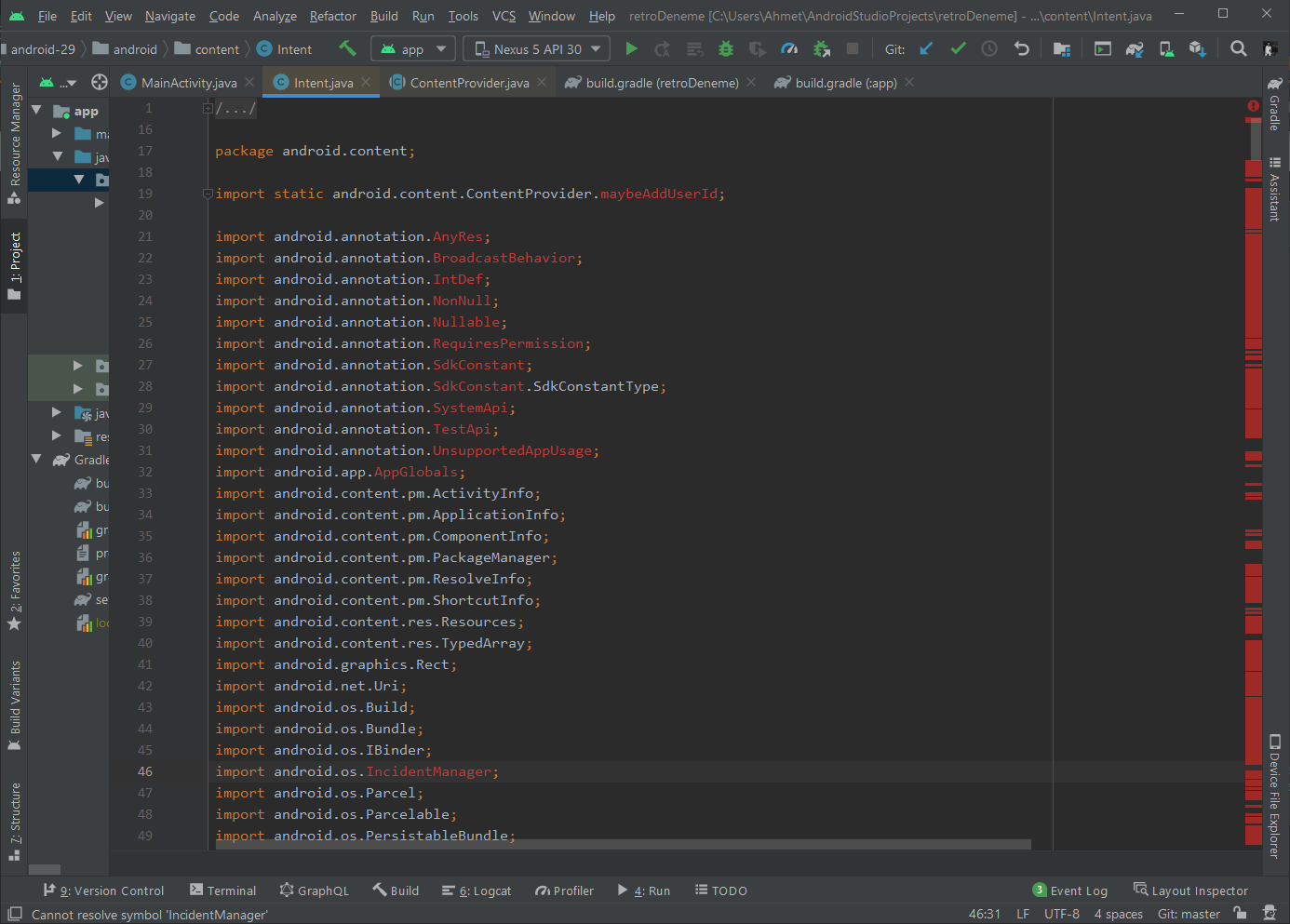 有一个小窗口弹出,上面写着“您想更新Intent.java API 29到30吗?”,我说是的,所有的SDK文件都是这样的。所有的导入和函数都有一个“无法解析的符号.”错误。到目前为止我尝试过的是: