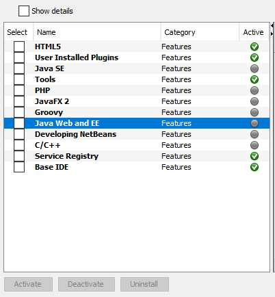 我刚刚检查了我的插件,它似乎是激活的Java和EE,但是“活动”符号没有显示为活动。这可能是问题的一部分吗?