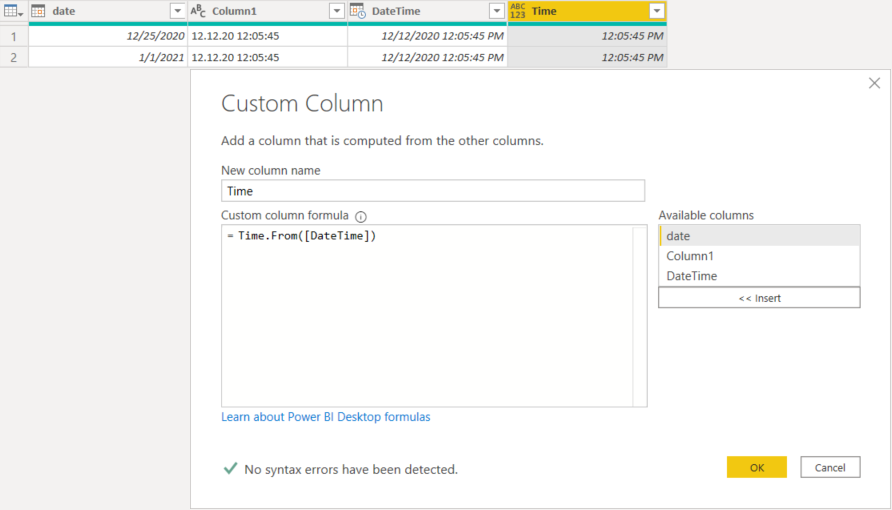 如果您的列名是DateTime,则可以在Power 中从它们中分离时间。只需添加一个自定义列,如下代码所示-