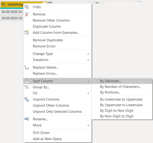 您还可以使用Space (“")将日期和时间分隔为power查询中的2列中的值-