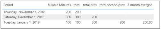 total = SUM('Client Services'[Billable Minutes])total prev = CALCULATE([total],PREVIOUSMONTH('Client Services'[Period]))total second prev = CALCULATE([total prev],PREVIOUSMONTH('Client Services'[Period]))3 month avergae =