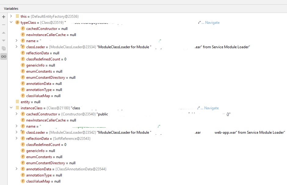 在我的例子中,是ModuleClassLoader for Module "my.ear" from Service Module Loader和ModuleClassLoader for Module "my-web-app.war" from Service Module Loader