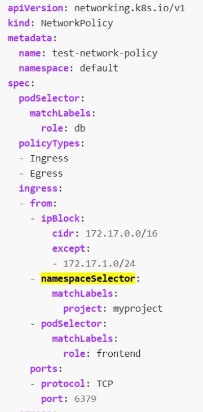 该选择器确定netpol将被应用到哪个吊舱。另外,请记住,netpol是一个名称空间对象(您可以通过执行kubectl resources来检查它)。因此,由于metadata.namespace的值是默认的,此策略将适用于默认名称空间中具有labe=db的任何pod。